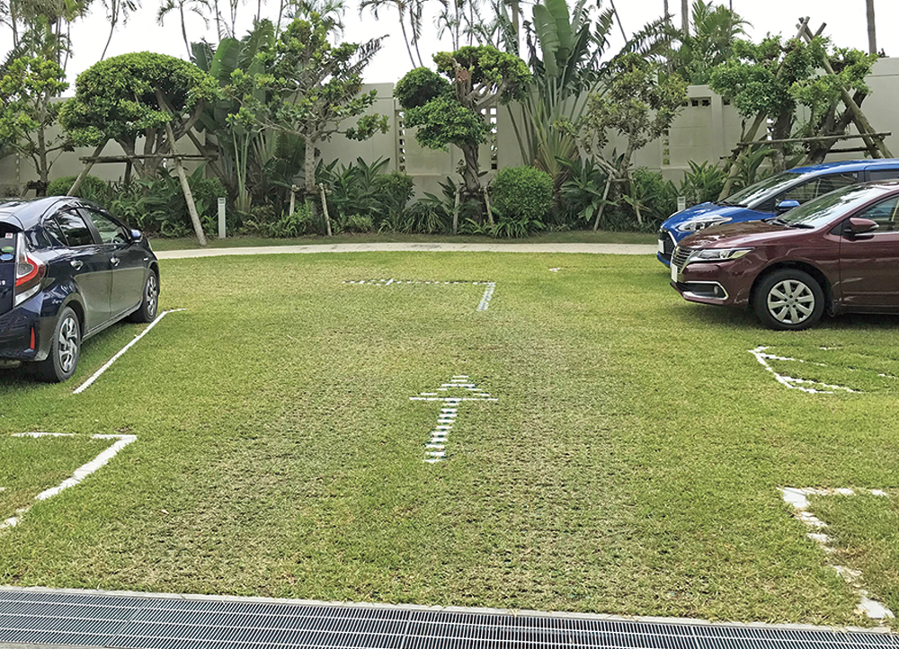 人工的で冷たい印象の駐車場が、緑豊かな芝生の駐車場に生まれ変わります。(緑化率:90.06%)