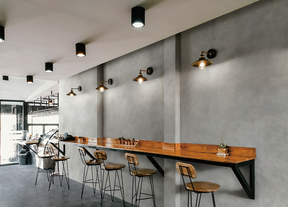 壁面はもとより天面や床面などにもモルタル調の重厚な仕上げを可能に。