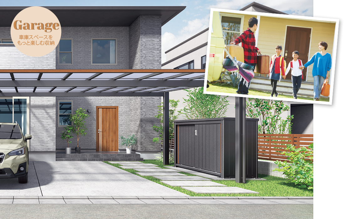 庭まわり・車庫スペース・玄関まわりに溶け込むデザインで収納の楽しみ方がもっと広がります。