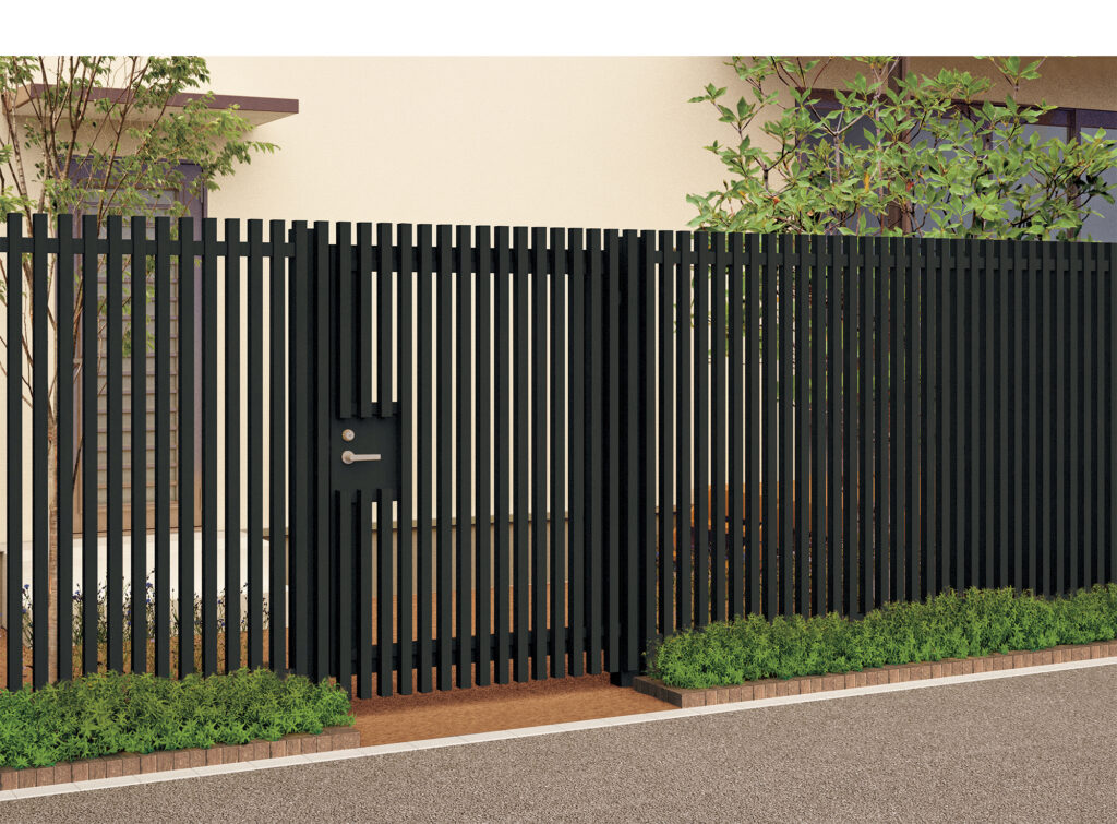 アレグリアフェンスTM1型/TL1型は、ボリューム感のある縦格子デザインで適度な目隠し効果があり、集合住宅や保育施設などに多く採用されています。木調カラーとアルミカラーの2タイプをラインナップしており、今回、アルミカラーにトレンドのブラックつや消し色が加わりました。