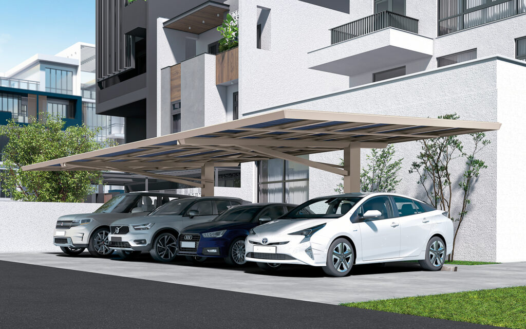 「ソリスルーフ」は、4台駐車分の屋根を2本の柱で支える独自の後方支持方式を採用。連棟設置した際も柱の本数が少なく、かつ入出庫や乗り降りがしやすい広々とした駐車スペースをつくることができます。両面発電式のソーラーパネルと屋根を一体化したスマートなデザインで、屋根の下面からも受光できるため発電効率に優れています。